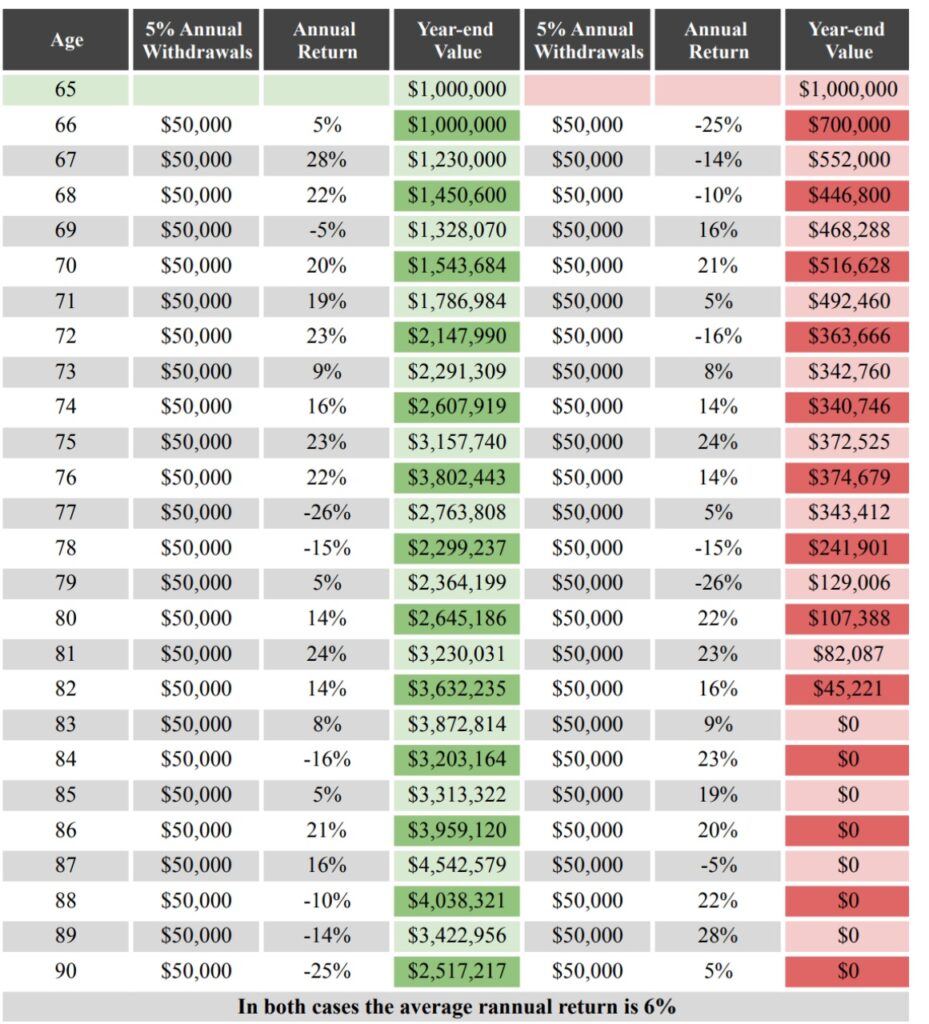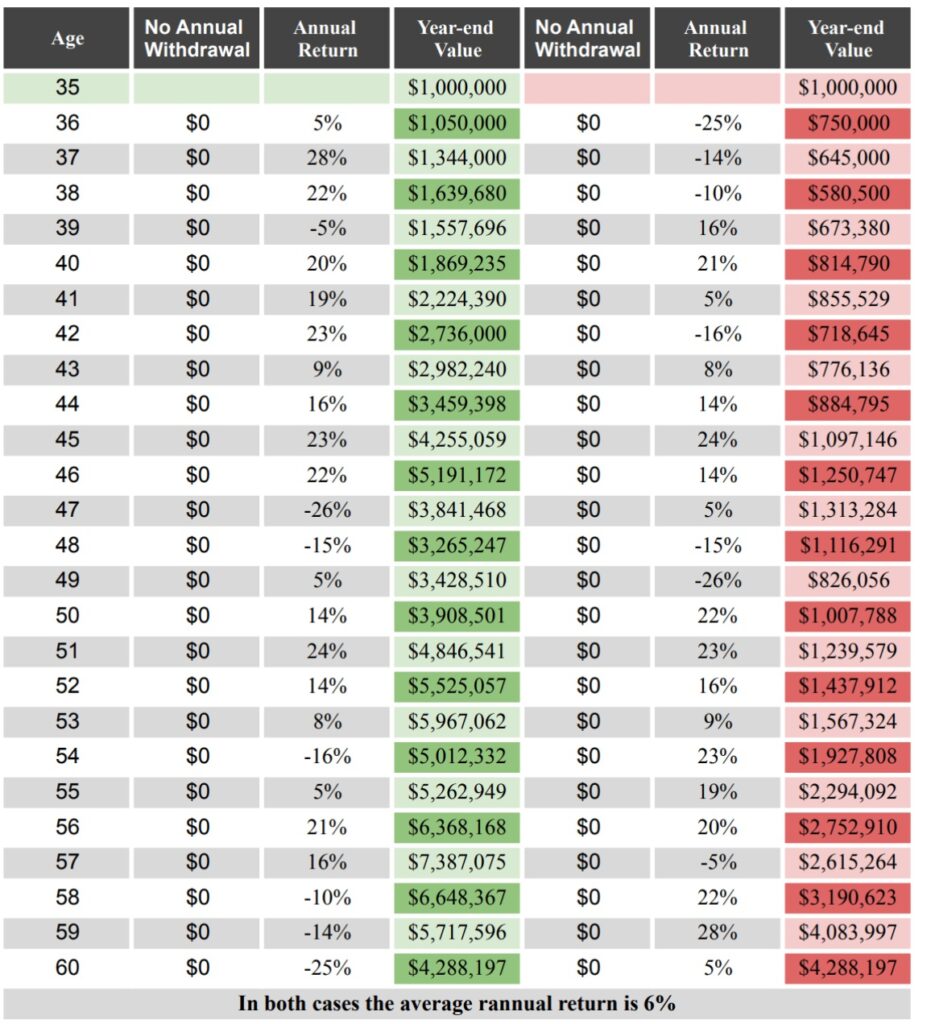 For example, consider two portfolios with the exact same annual returns, simply in reverse order. The green & red column on the left both start with 1 million and both end with 4,288,197. They average 6% returns. Again, they are the exact same returns just flipped.